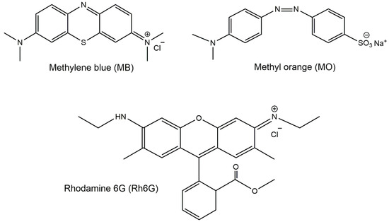 Safe water is a global need for all aspects of life (e.g., household, industrial, and agricultural purposes) and, considering the current limitation of water resources, the importance of effective water recycling and purification is constantly growing [1]. Commonly used technologies for wastewater treatment are helpful but should be improved in terms of their economic feasibility, efficiency, and environmental footprint [2]. Due to the absence of adequate wastewater treatment methods, different dangerous materials constantly enter natural water resources [3]. Every year, tons of chemically stable synthetic dyes are wasted from the pharmaceutical [4,5], garment [6], textile [7], leather, ink, paper [8], and plastic industries [9], negatively affecting aquatic life and also threatening human health, as many of these chemicals are highly hazardous and have been classified as mutagenic, carcinogenic, or genotoxic [10]. Furthermore, these water contaminants decrease sunlight penetration into bodies of water, which influences photosynthetic processes and affects aquatic flora and fauna [11]. In particular, sunlight plays a crucial role in the photosynthesis of aquatic plants. It provides the energy needed for the conversion of inorganic carbon to organic carbon compounds, which is the fundamental biological process on Earth. Synthetic dyes such as methylene blue (MB), rhodamine 6G (Rh6G) (model cationic dyes), and methyl orange (MO) (a model anionic dye) cause several health disorders like respiratory tract infections, skin disease, and eye irritation, so their removal from water resources is necessary [12].