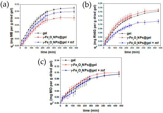 Adsorption capacities (qt, mg/g) of the native gel, γ-Fe2O3NPs@gel, and γ-Fe2O3NPs@gel + mf, versus time for MB (a), Rh6G (b), and MO (c).