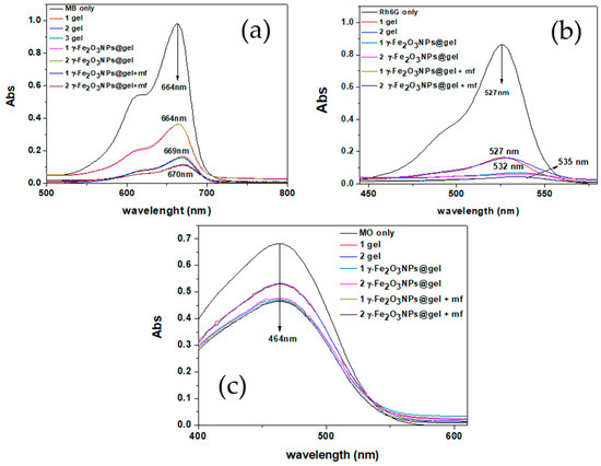 Conversely, regarding the cationic dyes, for MO, no significant spectral changes were detected after the filtration; the RE% values for MO are much lower (20–30%) compared to those for MB and Rh6G, probably due to the different charges in the dyes. Regarding the amount of MO adsorbed by the three hydrogel systems, γ-Fe2O3NPs@gel and γ-Fe2O3NPs@gel + mf show the same adsorption efficiencies (approximately 30%), compared to the lower amounts observed for the pristine gel (approximately 20%).