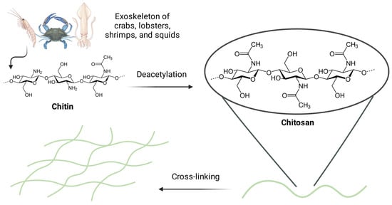 The process of obtaining chitosan-based hydrogels via cross-linking. The exoskeleton of, e.g., crabs, lobsters, shrimps, or squids is the source of chitin that may be deacetylated in alkaline media to obtain chitosan. The latter has functional groups such as C3–OH, C6–OH, C2–NH2, as well as acetylamino and glycoside bonds. Figure created with BioRender.com.