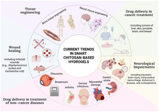 The positive effects of chitosan-based formulations in wound healing have been confirmed by numerous studies [6,145,146,147,149]. Because the current therapeutic approaches for neurological diseases sometimes yield unsatisfactory outcomes, smart chitosan hydrogels are investigated for their potential to solve problems such as limited accessibility or high levels of risk and discomfort during therapeutic procedures [161,162]. Some studies focused on the implementation of smart chitosan hydrogels in tissue engineering related to skeletal and nervous systems [178,179,184,188]. Hydrogels are also known for their drug delivery capacities, which has been utilized in various diseases such as cancer [214], gastric ulcer [221], rheumatoid arthritis [223] or glaucoma [234].