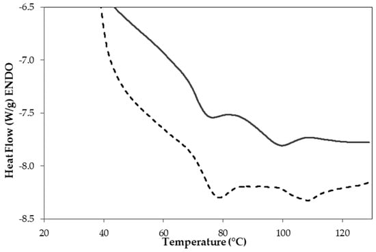 In addition, from the thermogram, it is possible to determine the enthalpy alteration linked with the gelatinization or denaturation process, which reflects the quantity of heat necessary for the thermal transition of the macro molecules under consideration and depends on the proportions of polar and non-polar interactions within the resulting aggregate []. In FB, the enthalpies associated with the first and the second peaks were 0.91 and 0.78 J/g, respectively, while higher values were observed in CP flours (i.e., 1.52 and 0.96 J/g, respectively, for the first and the second peaks). This indicates a significantly (p < 0.05) higher amount of unfolded native proteins in CP than in FB [].