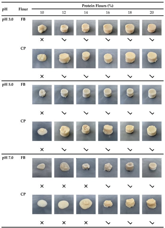 Aqueous solutions were prepared by adding 10, 12, 14, 16, 18, and 20% (w/w) of flour (FB and CP) and deionized water. The suspensions were magnetically stirred for 3 h at room temperature and after 2 h and 30 min of stirring, pH was adjusted to 3.0, 5.0, and 7.0 by adding 1 M HCl or 1 M NaOH. To induce gelation, FB and CP suspensions were transferred in 50 mL sealed falcon tubes and subjected to heat treatment in a water bath (95 °C for 1 h), followed by a first cooling in a water bath (15 °C for 10 min). The heat-treated samples were then stored at 4 °C for 24 h before analysis. The minimum gelling concentration (MGC) was determined as the sample with the lowest concentration that did not flow when the tubes were inverted [].