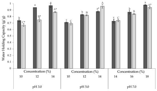 ) gels at 10, 12, and 14% at pH 3.0 and 5.0, and 14, 16, and 18% at pH 7.0. Different lowercase (a, b, c) (FB) and uppercase (A, B, C) (CP) letters indicate significant (p < 0.05) differences among the same source and same pH. Differences between sources (FB and CP) within the same pH and concentration are indicated with *.