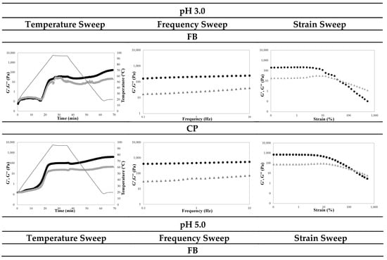 Temperature, frequency, and strain amplitude sweeps of faba bean (FB) and chickpea (CP) gels at pH 3.0, 5.0, 7.0 at the minimum gelling concentration (MGC). G′: black point symbols, G″: grey triangle symbols.