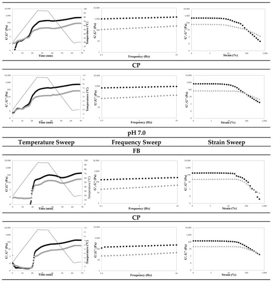 During the temperature sweep test between 65 and 85 °C, a steep increase of the elastic modulus (G′) was observed in both FB and CP (Figure 4, left panel). The results reflect the DSC thermographs (Figure 1), where the first peak ranged between 60 and 85 °C for both FB and CP. The rapid G′ and G″ increase can be mainly attributed to starch gelatinization, which is characterized by water absorption and swelling of the starch granules. At the same time, the subsequent decrease in G′ could be due to loss of crystallinity, uncoiling, dissociation of double helices, and leaching of amylose in the continuous phase of the starch [,]. Increasing the temperature to 75 °C, a slight increase in G′ in both sources has been observed, while during the holding time at 95 °C, both G′ and G″ did not change. In the final cooling step, G′ further increased and reached the highest value, indicating the presence of a gelled structure. The increase of G′ can be attributed to the formation of hydrogen bonds, which stabilizes and strengthens the matrix [,], and to the presence of starch granules and fiber particles, which acted as active fillers and reinforced the gel [,,,,,,,,,,,,,,,,,,,,,,,,,,,,,,,,,,,,,,,,,,,,,,,,,]. In addition, also the proteins fraction play a role in the gel formation. Indeed, an increase of the temperature up to 95 °C caused proteins denaturation, the exposure of their interior part, and, as a consequence, the formation of hydrophobic interactions and the formation of a network typical of a gel structure [,]. Similar temperature sweep profiles have been observed between the two sources at all the pH considered (Figure 4).