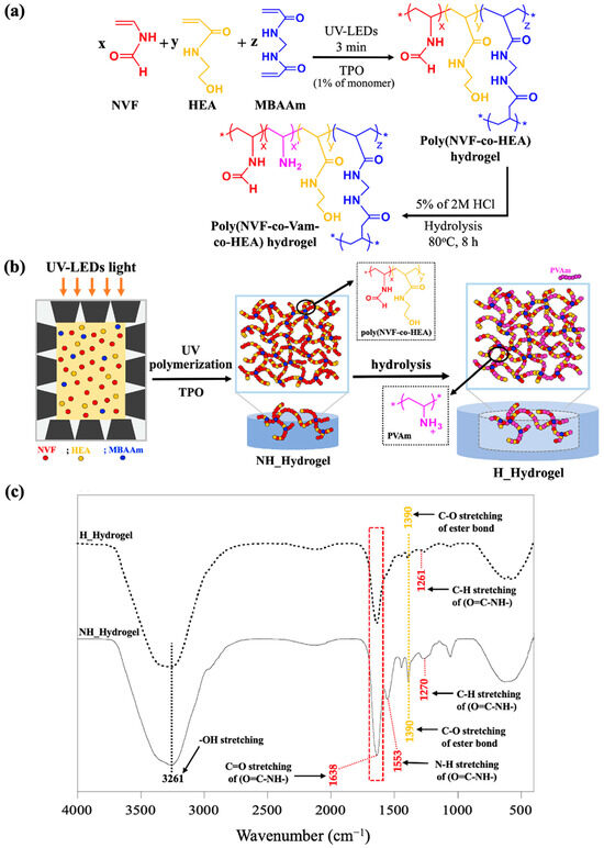 Preparation of hydrolyzed hydrogel (H_Hydrogel). (a) Schematic of preparation partway of poly(NVF-co-VAm-co-HEA) hydrogels in two steps: (1) preparation of poly(NVF-co-HEA) hydrogel and (2) hydrolysis to amino group. (b) Schematic illustration of preparation of H_Hydrogel. (c) FTIR Spectra of H_Hydrogel and NH_Hydrogel.