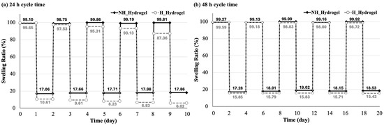 The swelling and de-swelling behavior of the hydrogels in water and ethanol, assessed through cycling tests that compare different durations: (a) a 24 h cycle time and (b) a 48 h cycle time.