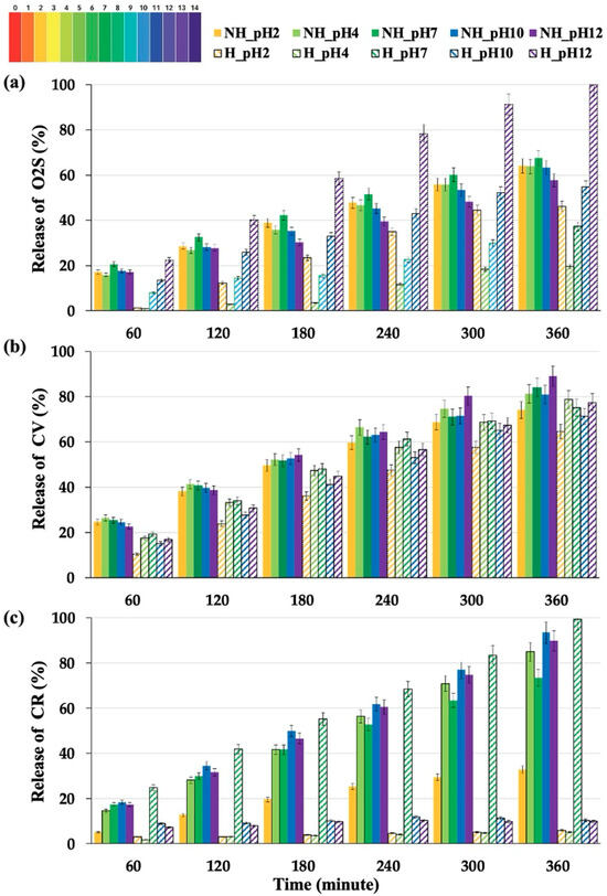 Figure 7 illustrates the cumulative percentage of dye release from NH_Hydrogel and H_Hydrogels over time, monitored across various pH conditions (pH 2, 4, 7, 10, and 12). The release charts show notable differences between NH_Hydrogel and H_Hydrogels, especially with O2S dye (Figure 7a). NH_Hydrogel exhibits a consistent release across most pH levels, with a slightly lower release at pH 12. Conversely, H_Hydrogel, which contains PVAm, demonstrates pH-responsive release capabilities, with lower release rates at acidic and neutral pH levels and significantly higher release at basic pH levels (pH 10 and 12), with pH 12 showing a release rate 60% higher than that of any other sample. This stems from the pKa values of primary amines typically range from about 9 to 11. This means that at a pH lower than the pKa, the amine group is mostly protonated (NH3+) carrying a positive charge and capable of electrostatic interactions with negatively charged groups. For CV dye release (Figure 7b), the release rates for NH_Hydrogel and H_Hydrogels are similar, with both hydrogels showing no significant change in release profile across different pH levels. CV contains tertiary (R3N) amines, which have similar or slightly lower pKa values than do primary amines but follow the same principle in that they are protonated and positively charged at pH values below their pKa. Thus, it is unlikely that there will be strong interactions with either hydrogel.