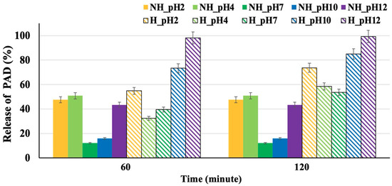 The cumulative percentage of PAD released from the hydrogels at different pH values over 2 h (120 min) is shown in Figure 8. The data reveal that the PAD release from NH_Hydrogel follows a burst release pattern, followed by very little subsequent release over the remaining 4 h (data presented in the Supplementary Materials; Figure S1). Under acidic conditions (pH 2 and 4), around 50% of the PAD contained in the NH_Hydrogel is released. However, at pH 7 and 10, the release rates drop to less than 20%, and at pH 12, the release is around 40%. For the H_Hydrogel, a burst release pattern is observed again, but the hydrolyzed gel can still release PAD from its structure in the second hour. Under acidic conditions (pH 2 and 4), the total release amounts to 70–75%. At a neutral pH of 7, the release is about 55%, and at higher pH levels (pH 10 and 12), the release rate increases to 90–100%. This behavior is attributed to the H_Hydrogels tendency to collapse at these pH values, with the greatest collapse occurring at pH 12, which in turn allows for the expulsion of more PAD from the hydrogel system. To better understand the release kinetics, three release kinetic models were used to assess cumulative release: zero-order (cumulative release vs. time), first-order (log cumulative release vs. time), and Higuchi’s (cumulative release vs. square root of time) [35,36]. The data suggest that the release from the hydrogel samples studied was best described by Higuchi’s model (data presented in the Supplementary Materials, Table S1).