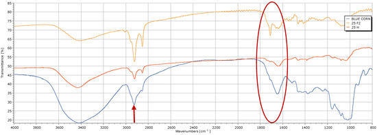 FTIR spectra of the 25F, 25H, and blue cornmeal (Zea mays L.) gel samples.