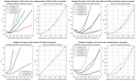 In the graph for a collagen concentration of 30 mg/mL and 0.1% acetic acid, the test increments were 200 μL. Then, the same ratios were repeated with increments of 100 μL to ensure that the mixing system presented in our previous article [34] dosed the correct medium amount. The results showed that they differed minimally. However, the volumetric titration for collagen 20 mg/mL and 0.1% acetic acid, which was tested the same way but first with increments of 100 μL and then repeated in the same ratios with increments of 100 μL, resulted in a slight change in a final titration curve due to the lack of material.