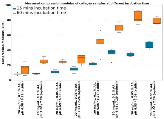 According to linear regression parameter estimates, all three parameters significantly affect the resulting stiffness of collagen bioink see Table 1 and Table 2. The increase in strength over time is evident. After 60 min, the measured modulus did not increase further; therefore, the gels reached their final stiffness (model estimate ‘Incubation time’). A comparison of gels prepared at different concentrations of acetic acid showed an increased compression modulus of gels prepared in 0.05% AA for both collagen concentrations (model estimate ‘AA concentration’—negative coefficient).