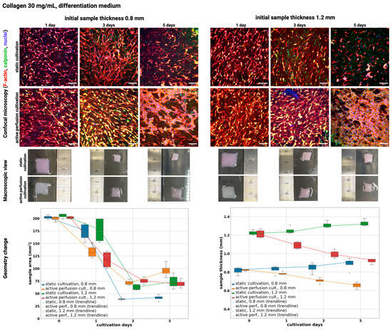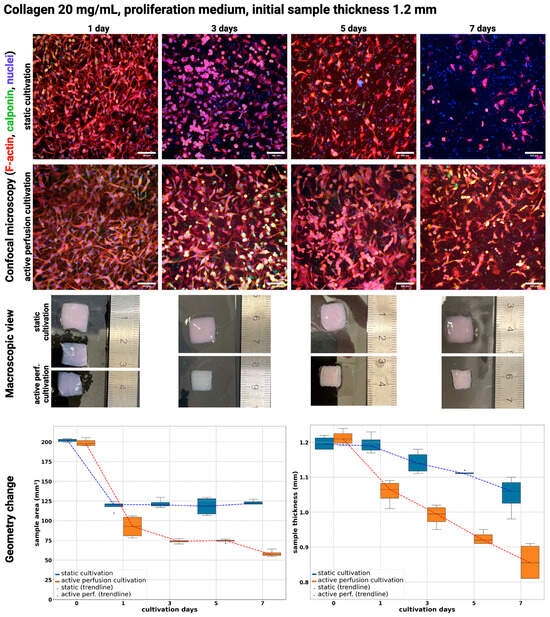 However, there was one interesting finding: in the proliferation medium, the cells were able to remodel structure in terms of area and thickness in the same manner as in the differentiation medium; the thickness change was inverse (negative rank for cultivation in the regression model). In active perfusion, there was a similar scenario as in proliferation media. The initial thickness was reduced from approx. 1.2 or 0.8 mm to approx. 0.9 or 0.6 mm. On the other hand, in static conditions, the thickness increased over cultivation time from an initial approx. 1.2 or 0.8 mm to approx. 1.3 or 0.9 mm. We believe this is caused by shrinkage caused by calponin active and viable cells on the top side of the sample, whereas mainly dead or apoptotic cells are on the bottom side. The active perfusion allows overall diffusion; thus, both sides have viable cells, and substrates are remodeled homogenously. The dynamic samples were homogenously reduced in terms of thickness, and the static samples created more blob-like structures, as seen in cell morphology.