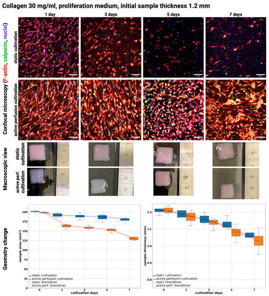 Confocal microscopy images (top) of cultivated samples in 30 mg/mL collagen and their macroscopic view (middle) and geometrical change of samples area and thickness (bottom). Cultivation for 1, 3, 5, and 7 days in a proliferation culture medium under static and dynamic conditions. F-actin was stained using Alexa Fluor™ 594 Phalloidin (red), Calponin H1 with Alexa Fluor™ 488 (green), and cell nuclei were counterstained using DAPI (blue), scale 100 µm. Nikon CSU-W1 confocal microscope with CFI Plan Apo VC 20× dry objective. Orthographic MIP-rendered projection. Boxplots with inner lines represent the median values; box borders 1st and 3rd quartiles; whiskers are the minimum and maximum; and the dots are outlier values.