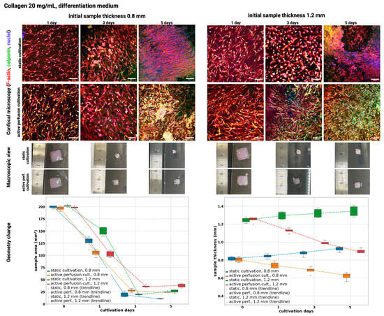 In 20 mg/mL bioink, there was a change in area from approx. 200 mm2 to approx. 60 mm2 when active perfusion for 7 days was used, whereas in static conditions, it was lowered to approx. 125 mm2. Especially for static cultivation, there was a major change after 1 day of cultivation; however, this change stagnated. In active perfusion, the change was observed on all days of cultivation. Thickness was reduced from approx. 1.2 mm to 0.85 in active perfusion to 1.06 in static.