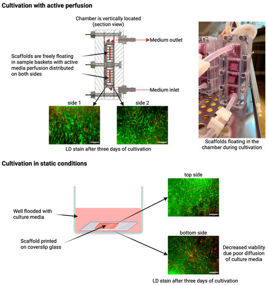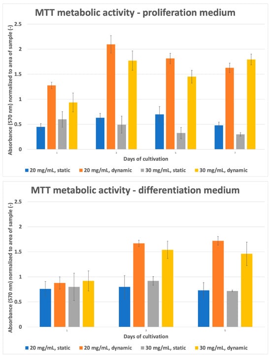 In addition, the MTT metabolic activity was determined. These MTTs are collated with confocal images and LD staining. The metabolic activity in dynamic culture is significantly higher than in static culture, as illustrated in Figure 7.