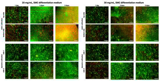 Cell viability for 20 and 30 mg/mL collagens in static and active media perfusion ‘dynamic’ cultivation in differentiation culture medium after 1, 3, and 5 days of cultivation. The images show both sides of each sample to demonstrate the unequal distribution of dead cells in the static sample, as the part of the gel adhered to the slide is not sufficiently nourished. Live cells are fluorescing green due to FDA uptake, and dead cells are fluorescing red due to PI uptake.