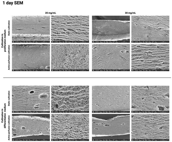 Hydrogel architecture visualized by SEM microscopy after 1 day of cultivation for both collagen concentrations (20 and 30 mg/mL), both culture media, and static and active perfusion cultivation.