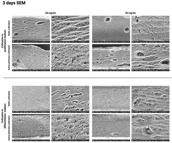 Hydrogel architecture visualized by SEM microscopy after 3 days of cultivation for both collagen concentrations (20 and 30 mg/mL), both culture media, and static and active perfusion cultivation.