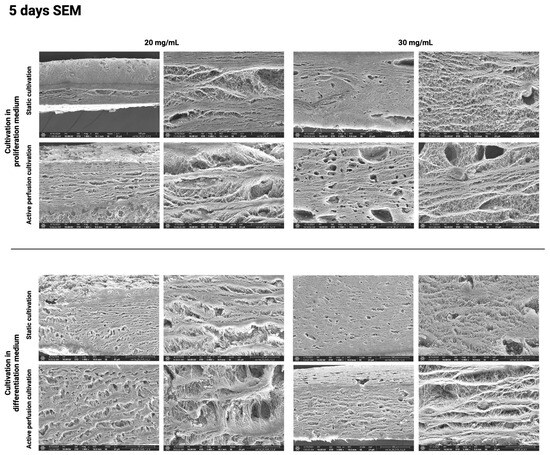 Hydrogel architecture visualized by SEM microscopy after 5 days of cultivation for both collagen concentrations (20 and 30 mg/mL), both culture media, and static and active perfusion cultivation.