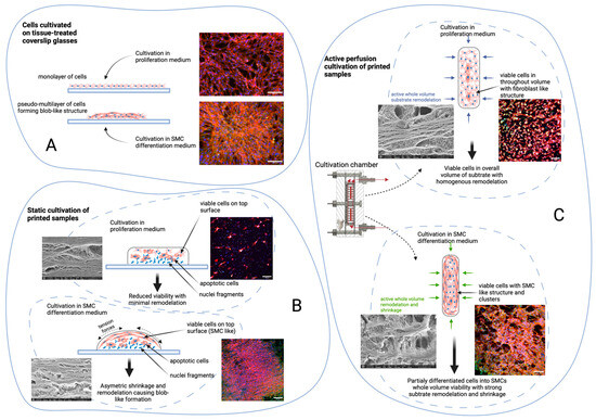 When comparing the samples of all culture types and culture media, it can be concluded that the best optimal morphological proliferation is achieved by the bioink sample with active perfusion with the SMC differentiation culture medium. In this sample, cells have high viability throughout the culture period, an optimal elongated shape with protrusions, high calponin production, and a high degree of remodeling of the collagen hydrogel in the ECM. This confirms that the choice of culture with active proliferation and the promotion of cell differentiation by culture medium chemicals have a significant impact on the success of cell cultures in highly concentrated collagen hydrogels. All these milestones are illustrated in Figure 15.