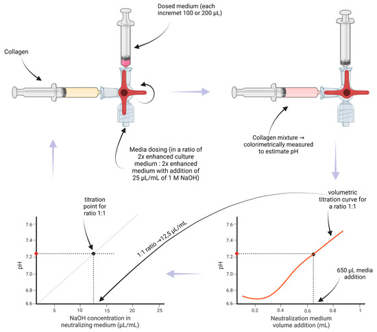The ideal addition of a 2× enhanced culture medium with the addition of 25 μL/mL 1M NaOH can be determined using a titration curve presented in Figure 17. For that, we prepared a simple table for selecting the ideal ratio for the first neutralization of collagen, i.e., if the ideal NaOH addition (μL/mL) is approximately 7, the closest number in the table is 7.14, which suggests that the perfect ratio is 5:2 (2× enhanced culture medium: 2× enhanced culture medium with NaOH addition), see Table A1.