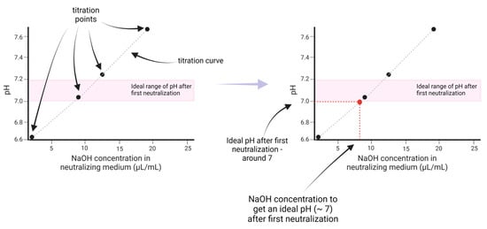 The estimation procedure to obtain the ideal ratio for the first neutralization to have a pH between 7 and 7.2. The obtained titration points (left) were interpolated with a titration curve. The ideal NaOH concentration in the medium equals the x-value for the intersection of the titration curve and the pH value (right).