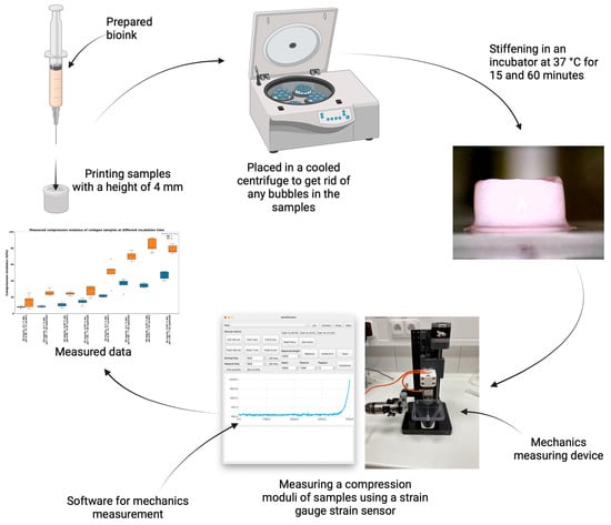 To measure the compression moduli of collagen hydrogels, for each collagen (with concentrations of 20 mg/mL and 30 mg/mL dissolved in 0.05% and 0.1% AA), two bioinks were prepared, one for an ideal titration ratio and the other with a ratio for 0 NaOH. Each bioink was printed into custom-made cylindrical molds, with samples of 4 mm in height. After printing, the gel sample molds were placed in a cooled centrifuge to remove any bubbles in the sample, ensuring more accurate mechanical measurements, and then placed in an incubator at a temperature of 37 °C for approximately 15 and 60 min for the samples to solidify. The compression moduli of the samples were measured using a custom-built compression test device. This device utilizes a micrometric linear actuator controlled by a stepper motor and strain gauge strain sensor HT sensor TAS501N (HT Sensor Technology Co., Ltd., Xi’an City, China). The measuring speed was set to 0.1 mm/s. The Dinolite USB microscope (Dino-Lite Digital Microscope, AnMo Electronics Co., Taipei, Taiwan), perpendicular to the sample, was attached to visualize the dimensional change. Measured force/compression depth data were transformed into stress/strain curves. Real stress and strain were estimated using changing geometry from microscope data. Compression modulus was estimated as a linear part at 0.3–0.4 strain region. The entire process is imaged in Figure 18.