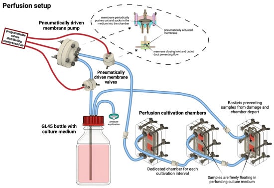 Active perfusion system compounded of a system of reservoir, pump, valves, and culture chambers, with samples freely floating in prefunding culture medium.