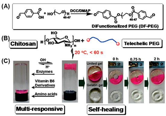 Investigation into the preparation and properties of dynamic imine bond hydrogels. (A) Synthesis of DF-PEGs; (B) DF-PEGs coupled with chitosan to form dynamic hydrogels; (C) The multi-responsive and self-healing properties of dynamic hydrogels. Reprinted with permission from Ref. [15]. Copyright © 2011 American Chemical Society.