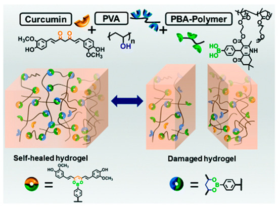 A curcumin-loaded self-healing hydrogel based on the formation of dynamic boronic esters. Reprinted with permission from Ref. [20]. Copyright © 2010 Royal Society of Chemistry.