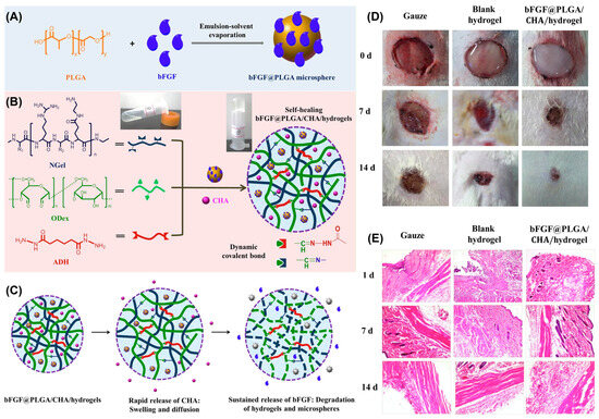 (A) Fabrication of poly (lactic-co-glycolic acid) microspheres-loaded bFGF@PLGA microspheres. (B) Preparation of bFGF@PLGA/CHA/hydrogels. (C) The sequential delivery of bFGF@PLGA/CHA/hydrogels. (D) Gross observation and (E) H&E staining of the wound skin treated with the gauze, blank hydrogels, and bFGF@PLGA/CHA/hydrogels. Adapted with permission from Ref. [48]. Copyright © 2019 Elsevier B.V.