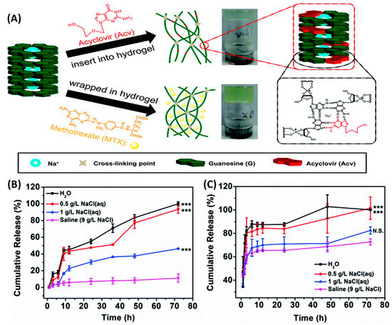 (A) Schematic illustration of different drug (methotrexate (MTX) and Acyclovir (Acv)) encapsulation forms in the GB hydrogel. Cumulative (B) Acv and (C) MTX release as a function of time after exposure to saline (purple line), 1 g L−1 NaCl solution (blue line), 0.5 g L−1 NaCl solution (red line), and H2O (black line). N.S. p > 0.05 and *** p < 0.001. Adapted with permission from Ref. [53]. Copyright © 2020 Royal Society of Chemistry.