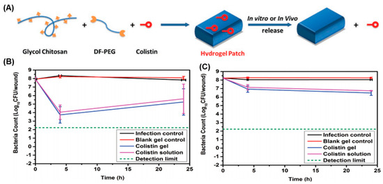 (A) Illustration of the synthesis of the colistin-containing hydrogel. The “burn” infection model test of the colistin-loaded hydrogel against (B) colistin-sensitive and (C) colistin-resistant strains. Adapted with permission from Ref. [56]. Copyright © 2016 Wiley-VCH.