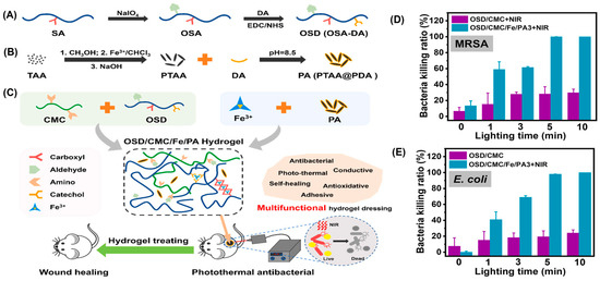 (A) Preparation scheme of oxidized sodium alginate-grafted dopamine (OSD) and (B) polydopamine-coating poly (thiophene-3-acetic acid) (PA); (C) Preparation and application of OSD/carboxymethyl chitosan/Fe3+/PA (OSD/CMC/Fe/PA) hydrogels. The killing ratio of (D) MRSA and (E) E. coli in OSD/CMC and OSD/CMC/Fe/PA3 hydrogels under NIR with different lighting times. Adapted with permission from Ref. [65]. Copyright © 2023 Elsevier B.V.