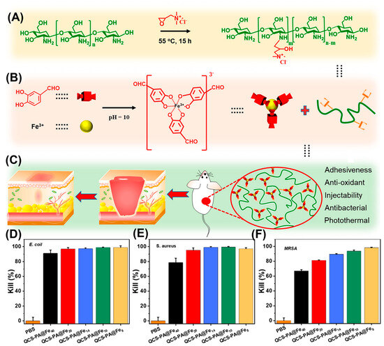 Compared to the introduction of a single type of dynamic chemical bonds in the previous example, Guo et al. utilized protocatechualdehyde to construct a dual-dynamic-bond cross-linked quaternized chitosan (QCS) hydrogel [71]. The catechol group on protocatechualdehyde formed a coordination complex with Fe3+ (PA@Fe), while the aldehyde group on protocatechualdehyde underwent a Schiff base reaction with the amino group of QCS (Figure 8A,B). This dual-dynamic-bond cross-linking endows the hydrogel with a pH response and good mechanical strength (Figure 8C). Through the antibacterial tests, the authors demonstrated that this hydrogel exhibited excellent antimicrobial activity against both Gram-negative (E. coli) (Figure 8D) and Gram-positive (S. aureus) (Figure 8E) strains due to the inherent antibacterial performance of QCS. Moreover, as the content of PA@Fe increased, this hydrogel was able to kill methicillin-resistant S. aureus (MRSA) with a high efficiency, which was attributed to the synergetic antibacterial activity of PA@Fe and QCS (Figure 8F). Under NIR irradiation, PA@Fe in this hydrogel served as photothermal agents, producing a controlled photothermal effect to denature the enzymes in the bacteria, giving a high in vivo antimicrobial activity against MRSA. This work demonstrates the potential of dynamic hydrogels with inherent antimicrobial activity as wound dressings for drug-resistant pathogens.