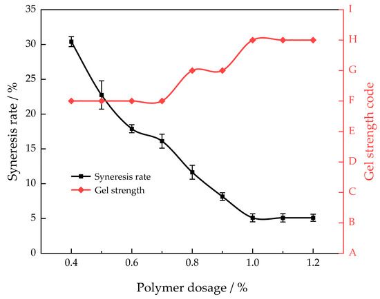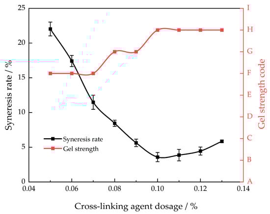 This article used polyethyleneimine as the gel cross-linking agent [24]. This cross-linking agent is a highly reactive substance that is ecologically benign and has low toxicity. Polymers can be easily cross-linked to create a high-strength gel, enhancing their performance in high-temperature conditions. A polymer with a mass fraction of 1.0% was chosen to investigate the impact of cross-linker dosage on the strength of the gel system and the rate of syneresis (30 days) at a temperature of 130 °C (Figure 2).