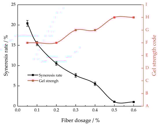 Nylon fiber was used as the gel stabilizer in this article. This stabilizer can be uniformly distributed in an adhesive solution to significantly enhance the stability and strength of the gel [15]. The mass fraction of the polymer was 1.0% and the mass fraction of the cross-linking agent was 0.1%, the gelling temperature was 130 °C, and the influence of different amounts of nylon fiber on the gel syneresis rate (30 days) was examined (Figure 3).