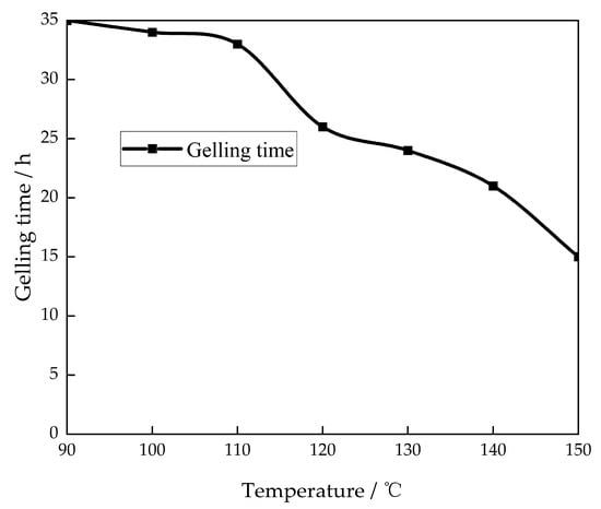 The prepared gel solutions were placed at temperatures of 90 °C to 150 °C to examine the effect of temperature on the gelation time (Figure 5).