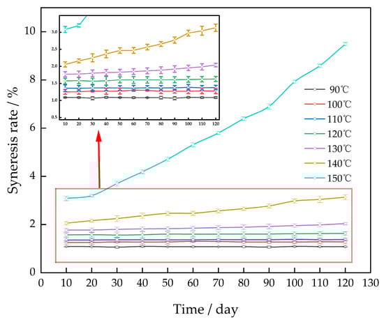 The gel system was subjected to aging at temperatures of 90 °C to 150 °C for a duration of 120 days in order to investigate the impact of ambient temperature on the rate of gel syneresis (Figure 6).