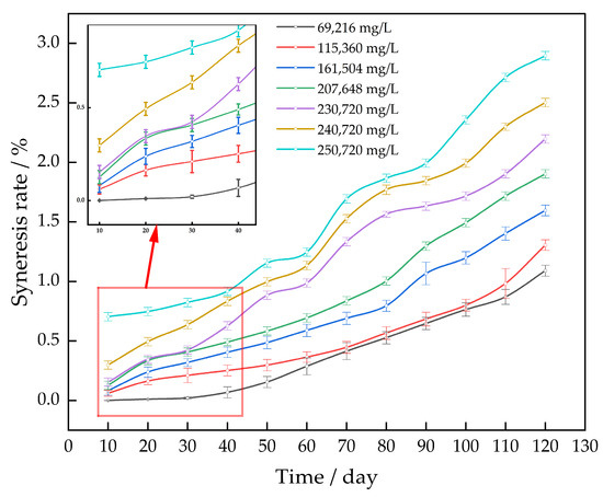 This article evaluates the thermal stability of the gel through the syneresis rate [28]. The initial weight of the gel and the weight of water discharged from the gel after several days of aging were measured, and the syneresis rate was defined as the proportion of the weight of the water expelled after a period of gel aging to the original weight of the gel.
