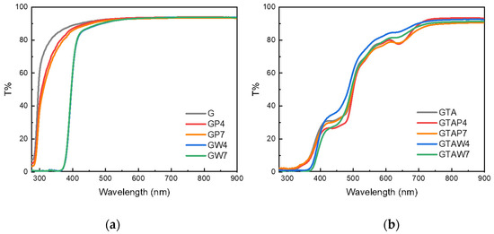 Nanocomposite films were prepared from gelatin dissolved in PVP-stabilized WO3 sols obtained through an ion exchange technique [26,28]. The hydrodynamic diameter of the nanoparticles measured by means of DLS was below 3 nm, in agreement with previous data [25,26]. Gelatin films, which were colorless in the absence of NPs, assumed a light yellow color when loaded with the metallic oxide nanoparticles (Figure S1). The composite films prepared at different pH values did not exhibit appreciably different intensities, whereas their color became an intense yellow/orange after crosslinking with GTA. The optical properties of films obtained with gelatin (G) and GTA-crosslinked gelatin (GTA) prepared in the presence of PVP at pH 4 (GP4 and GTAP4) and pH 7 (GP7 and GTAP7) and doped with WO3 NPs (GW4, GW7, GTAW4, and GTAW7) were characterized through transmittance measurements, as reported in Figure 1.