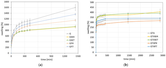 Swelling curves of (a) uncrosslinked films and (b) crosslinked films. Each value was determined in triplicate.