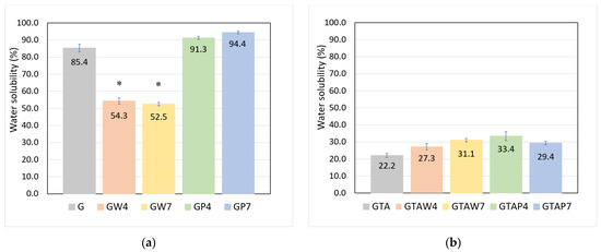 In agreement with the swelling data, the solubility of functionalized films was significantly lower (around 50%) than that of G and GP films (more than 80 and 90%, respectively), as can be seen in Figure 3. Crosslinking not only reduced solubility but also canceled the differences between groups. However, although the difference was not significant, GTAW samples displayed slightly higher values than the other groups, in agreement with the swelling data.