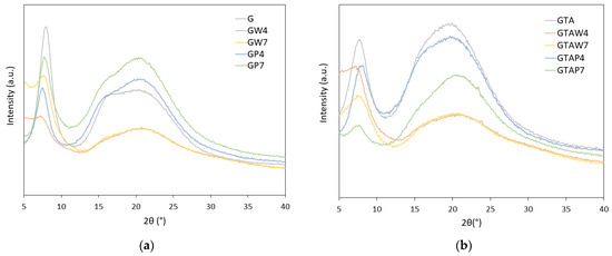 The X-ray diffraction pattern of gelatin provided some insight into its characteristic structure. The XRD pattern of G film, as shown in Figure 4, showed the presence of a peak centered at about 7.5°/2θ, related to the diameter of the portions of triple helices, and a broad halo, centered at about 20°/2θ and related to peptide bonds [33]. The ratio between the relative intensities of these two signals can be considered a measure of the crystallinity of the sample. The higher the relative intensity of the low-angle peak, the more crystalline the sample, as it contains a greater number of ordered portions. The comparison with the profiles from functionalized materials provided evidence of the higher relative intensity of the low-angle peak in the pattern of G films compared to the GP samples, where the presence of the polymer affected the aggregation of the amino acid chains into a triple helix, as observed through the differential scanning analysis. The relative intensity of the peak at about 7.5°/2θ was also low in the patterns of GW samples, but the reduction in the intensity of the whole pattern did not allow a proper evaluation. The comparison of the XRD patterns of crosslinked samples with those of uncrosslinked ones generally revealed a reduction in the relative intensity of the low-angle peak, suggesting a smaller triple-helix content; the aldehydic groups of GTA reacted with the ε-amino groups of lysine and hydroxylysine, thus decreasing renaturation.