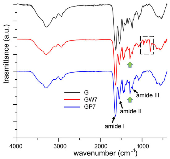 Gelatin displayed a FT-IR spectrum characterized by several absorption bands: the main ones fell at 1653 (amide I, C=O stretching), 1550 (amide II, NH bending), and 1238 (amide III) cm−1 [34]. These bands were clearly appreciable, although slightly shifted in comparison to those reported by Staroszczyk for fish gelatin, in the spectra of G as well as GTA samples (Figure 5 and Figure S5a). The spectra from GP and GPW films showed the presence of further bands, which cannot be ascribed to gelatin. In particular, the comparison between the spectra of pure PVP and GW7, as reported in Figure S5b, showed that, although several bands of PVP were very close to those of gelatin, the intense absorption band at 1290 cm−1 can be ascribed to the C–N bending of the PVP [35]. Moreover, the spectrum from GW7 showed the presence of absorption bands in the region of 1000–800 cm−1, which can be attributed to the presence of the nanoparticles. In particular, the intense absorption band at about 810 cm−1 was due to the O–W–O stretching mode [36]. The slight shift of the characteristic bands of gelatin in the spectra of the functionalized films (Table S1) suggested a possible interaction with the nanoparticles. No significant differences in the FT-IR spectra were found among the samples prepared at different pH values (GP4 vs. GP7 and GW4 vs. GW7).