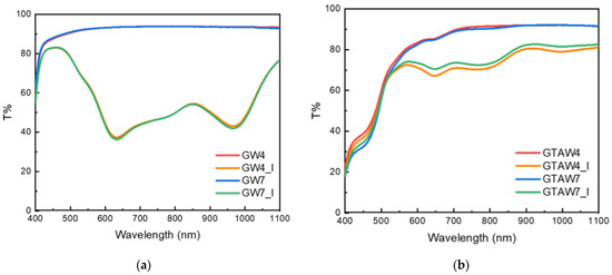 Transmittance spectra of gelatin films modified by WO3 NPs before and after irradiation. (a) GW4 and GW7 spectra before and after irradiation (GW4_I and GW7_I). (b) GTAW4 and GTAW7 spectra before and after irradiation (GTAW4_I and GTAW7_I).