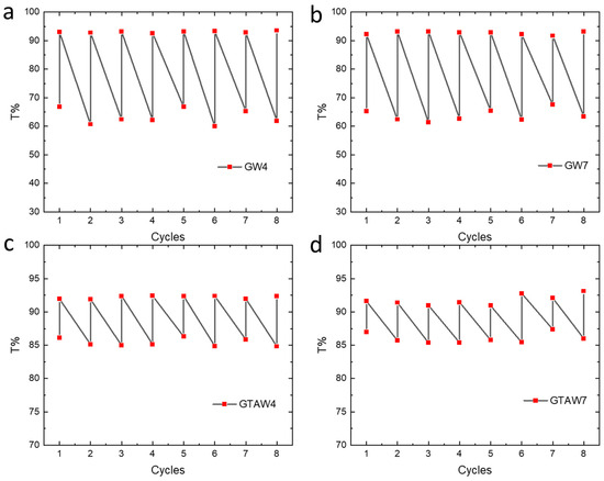 All the samples irradiated for 20 s showed a complete reverse photochromic reaction after exposure to air for three days. This slow reversibility process was not accelerated either by light irradiation (irradiation performed at 660 and 850 nm) or by thermal heating (performed at 60, 80, and 100 °C). The reverse photochromic reaction was due to the oxidation of W5+ to W6+ by oxygen and can be slowed by the stabilization of W5+, given its interaction with groups such as COOH and OH [40]. According to this consideration, in our system, the hydroxyl groups that favored photochromism could also have a role in the slow bleaching. The bleaching effect of gelatin and GTA–gelatin samples was evaluated by irradiating the samples under the same conditions. Although the crosslinked samples had less efficient photochromism, the bleaching time was the same as for the gelatin samples. Thus, it can be deduced that the bleaching of GTA–gelatin samples is less preferred than that of gelatin samples. GTA crosslinking probably further stabilizes W5+, slowing the reverse photochromism. Photochromic behavior was also monitored under eight irradiation cycles for all the samples (Figure 8). Each irradiation cycle was performed by irradiating the films for ten seconds at 365 nm and monitored by transmittance spectroscopy; irradiation cycles were performed every two days, allowing the complete reverse reaction before each cycle.