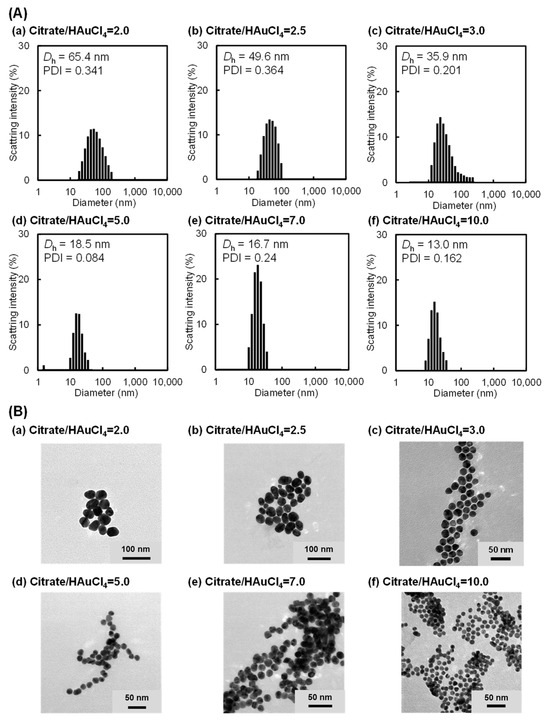 The molar ratio of sodium citrate hydrate to HAuCl4 (citrate/HAuCl4 ratio) is a crucial factor that strongly influences the formation of AuNPs [71,72,73,74]. In this study, citrate–AuNPs of various sizes were prepared by varying the citrate/HAuCl4 ratio (Scheme S1). Figure S1 shows the photographs and UV–Vis spectra of aqueous dispersions containing citrate–AuNPs prepared with various citrate/HAuCl4 ratios. An aqueous dispersion of the citrate–AuNPs changed slightly from red to purple upon decreasing the citrate/HAuCl4 ratio. Furthermore, the UV–Vis spectra demonstrated that the absorbance peak of the dispersion with citrate–AuNPs prepared at a lower citrate/HAuCl4 ratio shifted from 520 to 530 nm, which agrees with the slight change in the color of the dispersions from red to purple. In general, a small shift in the absorbance peak to a longer wavelength indicates the formation of AuNPs with larger sizes [73,74]. These results indicate that the size of citrate–AuNPs increases gradually with a decrease in the citrate/HAuCl4 ratio. Furthermore, we measured the size of citrate–AuNPs prepared with various citrate/HAuCl4 ratios using DLS measurements and TEM observations. As shown in Figure 1A, DLS measurements revealed that the hydrodynamic sizes (Dh) of citrate–AuNPs prepared at citrate/HAuCl4 ratios of 2.0, 2.5, 3.0, 5.0, 7.0, and 10.0 were 65.4, 49.6, 35.9, 18.5, 16.7, and 13.0 nm, respectively. In addition, the TEM images demonstrated that the size of citrate–AuNPs decreased with an increase in the citrate/HAuCl4 ratio, as shown in Figure 1B and Figure S2. As a result, we concluded that citrate–AuNPs of various sizes were successfully prepared by tuning the citrate/HAuCl4 ratio. The preparation of citrate–AuNPs of various sizes exhibited good reproducibility through the careful control of a few crucial factors, but more careful control of the preparation conditions is required for practical applications and scalability.